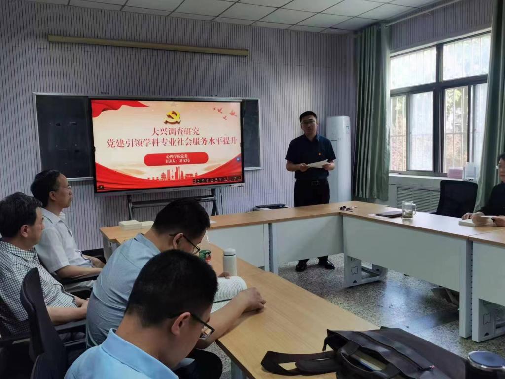 罗文伟以“大兴调查研究——党建引领学科专业社会服务水平提升”为主题,首先带领大家共同学习了中共中央办公厅印发的《关于在全党大兴调查研究的工作方案》,并结合自身学习领悟,联系学院实际工作,从以社会服务激发心理学学科专业特色活力、以党建引领学科专业社会服务力量、以调查研究提升学科专业社会服务水平三个方面和大家进行了深入交流。