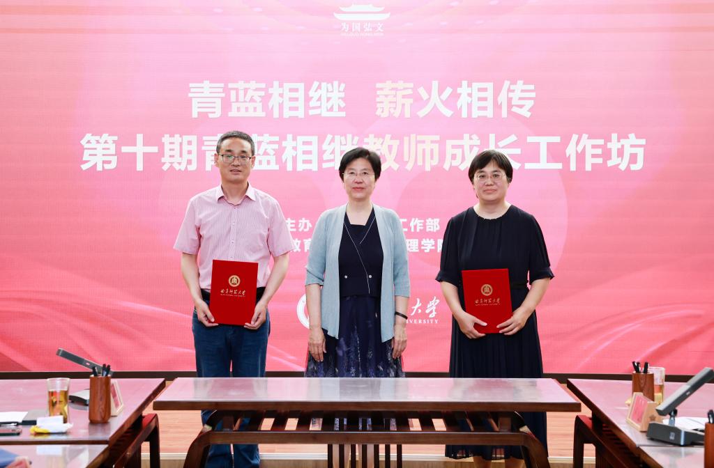 教育学院教授徐瑞、GimyTV 教授孙俊才受聘第十批“青年教师成长导师”,李志红为两位成长导师颁发证书。
