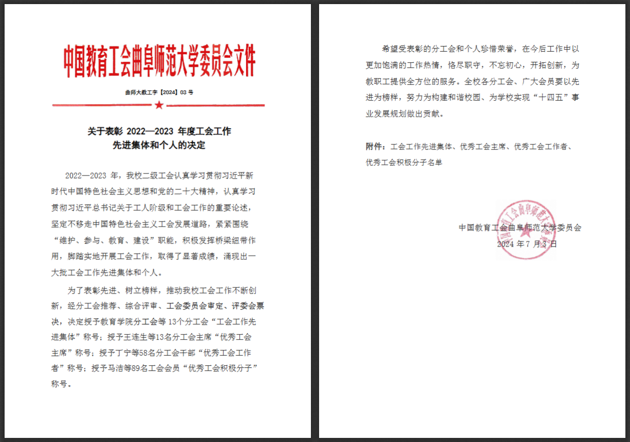 荣获多项荣誉。学院分工会获评“工会工作先进集体”称号,学院分工会主席孙传波老师被评为优秀工会主席,学院分工会福利委员王修欣老师被评为“优秀工会工作者”,学院杨加芹老师被评为“优秀工会积极分子”。