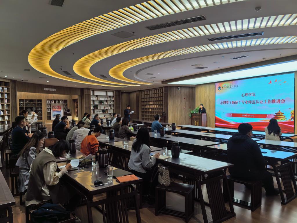 在中国教师博物馆讲习馆召开心理学专业师范专业认证工作推进会,学院党委书记罗文伟、院长何文广、党委副书记朱伟卫、副院长李海青、副院长王晓明及学院全体教职工参加会议。