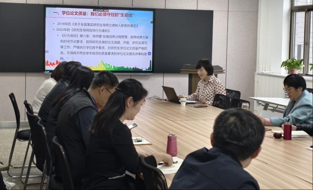 会议伊始,黄美玲副处长详细解读了学校及上级部门制定的有关研究生招生、培养、学位、教育管理等方面的规章制度。她结合实际案例,深入剖析研究生培养管理中的关键问题,着重强调了研究生论文质量的重要性,为导师们在日常指导工作中提供了明确的规范和指引,并对研究生学术道德建设与过程管理提出了具体要求。她指出,导师应切实履行第一责任人职责,严把学位论文开题、中期考核与预答辩等关键环节,杜绝学术不端行为。