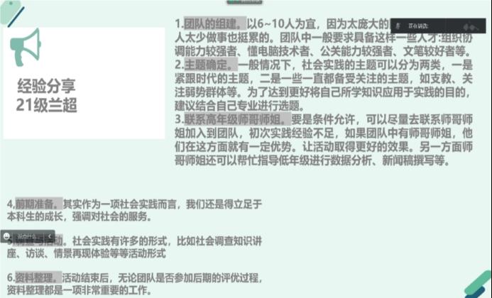 本次寒假社会实践经验交流会共分为六个环节。第一环节由主持人介绍关于此次实践活动的目的以及活动的主要内容,并宣布活动开始;第二环节由富有实践经验的师哥师姐为参会人员进行实践报告,21级兰超同学针对团队组建、主题确定、联系师长、前期准备、调查活动、资料整理等问题进行了汇报总结,分享了社会实践经验并进行社会实践安全教育,帮助同学们顺利地参与社会实践。