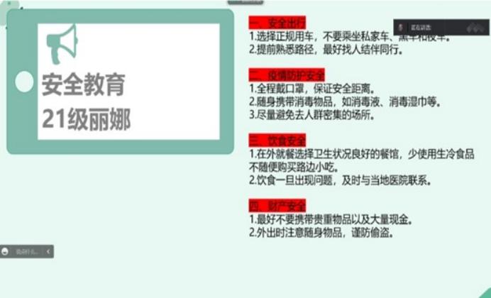 关于此次社会实践活动的另一大专题—“安全教育”专题,21级丽娜同学分别从安全出行、疫情防护安全、饮食安全、财产安全四个方面进行讲解,内容丰富,案例结合,参会人员表示受益匪浅,更加深刻地了解到安全教育的重要意义。