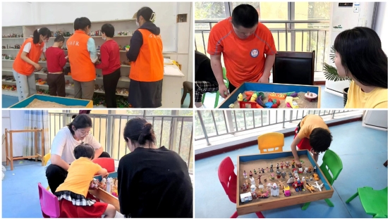 指导中心的孩子们自由选择自己喜欢的沙具,通过动手操作沙具和沙子在沙盘上构建自己的一方世界。志愿者在一旁细心观察、耐心协助,帮助孩子们共同完成沙盘作品,同时引导孩子们主动表达,说出自己内心的想法。志愿者通过沙盘作品和与孩子们的交流互动,了解他们的性格特点,走近他们的内心世界。活动结束后,志愿者详细记录每位孩子游戏过程中的表现,为沙盘游戏技术项目的开展效果和孩子们的成长变化提供反馈。孩子们感受到了志愿者的陪伴与关怀,逐渐打开自己的内心,在游戏中得到治愈与成长;志愿者也在实践中积累了心理学应用的经验,提高了专业素养和志愿服务素养,用自己的专业知识和辛勤付出服务群众、奉献社会。