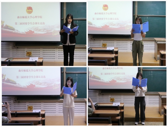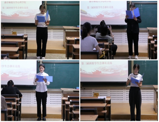 团委学生会部长候选人依次作竞选演讲。各候选人主要围绕自我介绍、工作经历、竞选优势、未来展望四个方面展开,进行精彩的发言,候选人们满怀热情和信心,充分展示了自己的工作能力和独特风采。