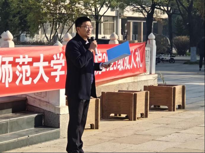 领誓人刘宇轩带领2023级全体本科生进行宣誓,同学们昂首挺胸,眼神坚定,精神饱满,高举右手,庄严宣誓。仪式现场充满庄重肃穆的氛围不仅让学生们深刻体验到成年的责任和担当,也让他们更加珍惜传统文化和师长们的教诲。