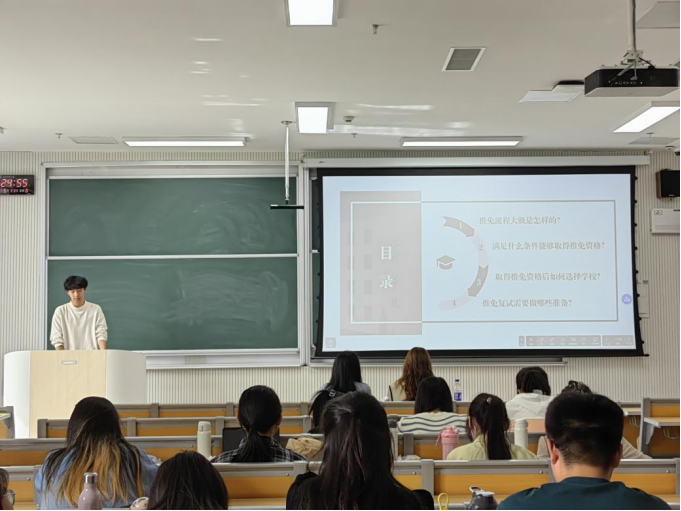 然后,周润泽分享了自己的保研经验。他从不同角度出发,详细解读了保研政策、申请流程、材料准备等方面的内容。他不仅强调了保研过程中的心态调整,鼓励大家保持积极乐观的心态去面对挑战和困难,还分享了他们在科研、论文发表等方面的经验,提醒同学们要注重平时的学术积累,为保研做好充分准备。