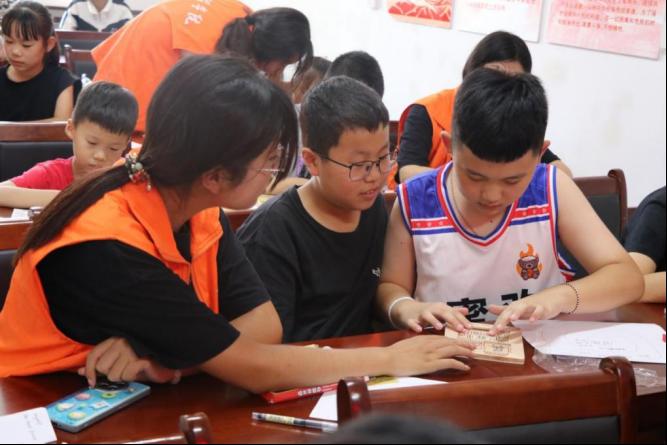 在到达鲁桥镇湖东村后,实践队员们精心策划了一系列丰富多彩的活动,旨在拉近孩子们之间的距离,提升他们的综合素质。团队将孩子们分成若干小组,共同挑战经典的团队建设游戏“华容道”。在这片孩子们益智的乐园里,实践队员们化身为游戏的指路人,不仅耐心细致地解答着每一个孩子在破解华容道中遇到的疑惑,耐心地解释规则,同时也给予适当的提醒和点拨,让不少孩子可以通过自己来走完一遍华容道。