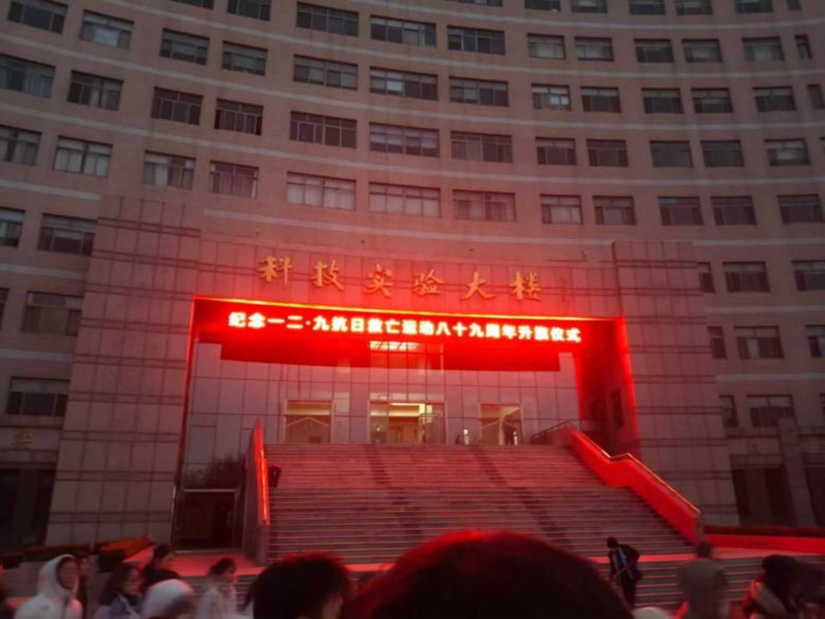 (曲阜校区)科技楼前广场参加学校的升旗仪式。在清晨的第一缕阳光下,学生们整齐列队,神情庄重。