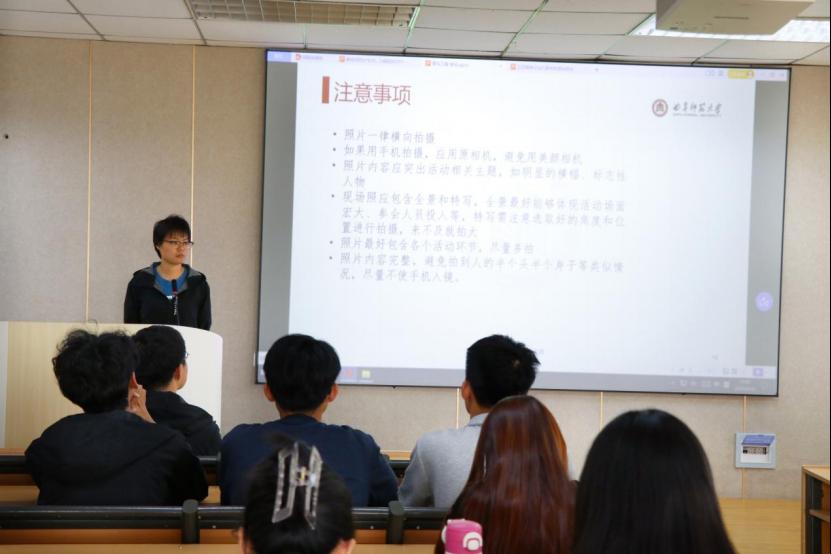 为提升学院团学工作技能,本次课程加入团学工作业务培训,2023级学生代表徐马安冉开展新闻摄影理论和实务分享。她认为,新闻现场的拍摄要以“真实性、时效性、新鲜性”为原则,区分会议新闻的庄重构图与文体活动的动态抓拍。她提出要规范设备的使用,结合具体实例传授拍摄要点与技巧。最后,她提示,新闻摄影要严格把控质量标准,强调横屏拍摄、主体完整、避免设备入镜等细节的规范。