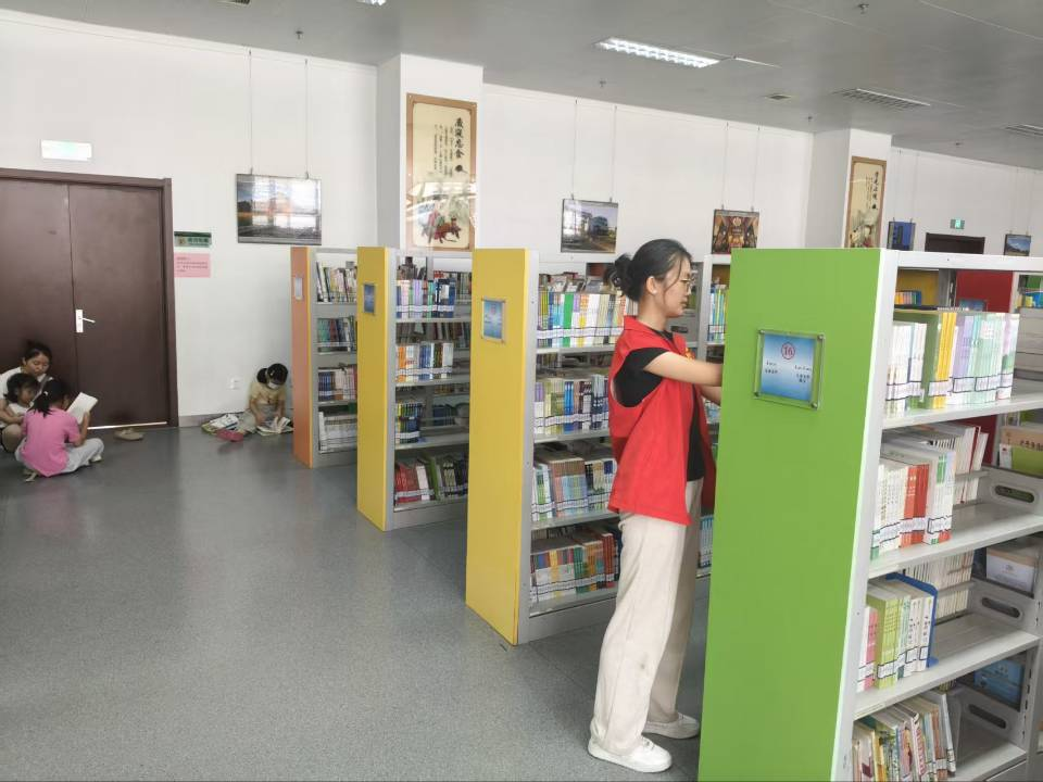 社区图书馆的幼儿借书室,是实践队开展服务的首站。作为社区孩童假期阅读的高频场所,这里汇聚各类幼儿绘本、图书。活动伊始,实践队成员们跟随工作人员系统学习图书分类规则,随后逐本核对图书的编号,将归还的图书高效精准归位。周二是图书馆每周开放首日,面对大量待整理的书籍,馆内工作人员表示:“每周一次大规模整理,既方便孩子找,又能让家长快速定位。”实践队成员特意把低龄幼儿认知类绘本放在下层,还设置“亲子共读推荐区”,将适合家长陪读的情感启蒙、科普绘本集中展示。整理时,遇到带孩子还书的家长,成员们会主动交流书籍内容,温馨互动中,不仅让幼儿借书室恢复整洁有序,也传递了“爱书护书”的理念,引导家长重视孩子阅读习惯培养。