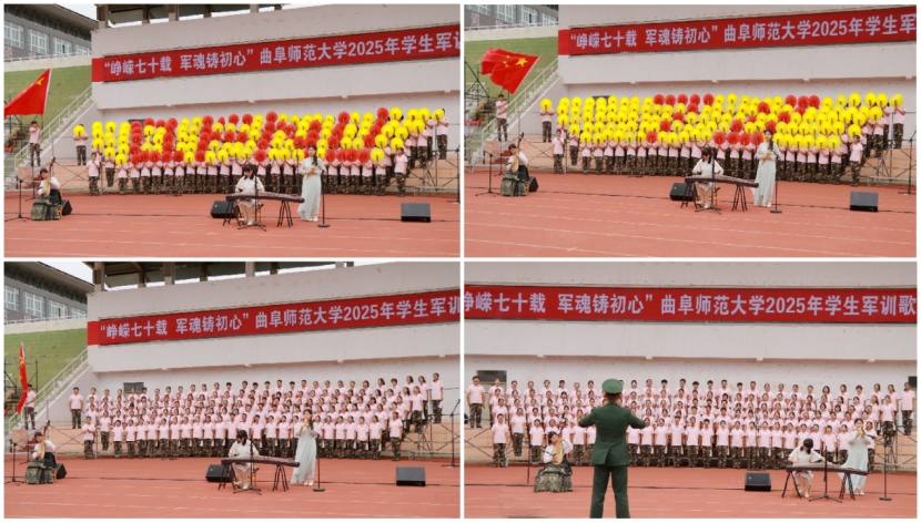 参赛队伍以歌为媒、以声传情,用一曲《当那一天来临》点燃全场爱国情怀,为祖国华诞献上青春礼赞。伴随着琵琶轻拨、古筝细颤、葫芦丝轻吟,学子们始终精神饱满、气势昂扬,歌唱者的眼神传递着对祖国的赤诚,演奏者的指尖流淌着对民族文化的热爱,每一句歌声、每一段旋律都凝聚着青春的力量。间奏时,心院学子们用不同颜色的手翻花摆出“QFNU”、“70”的造型,用行动向曲园70周年校庆送上自己最真挚的祝福。
