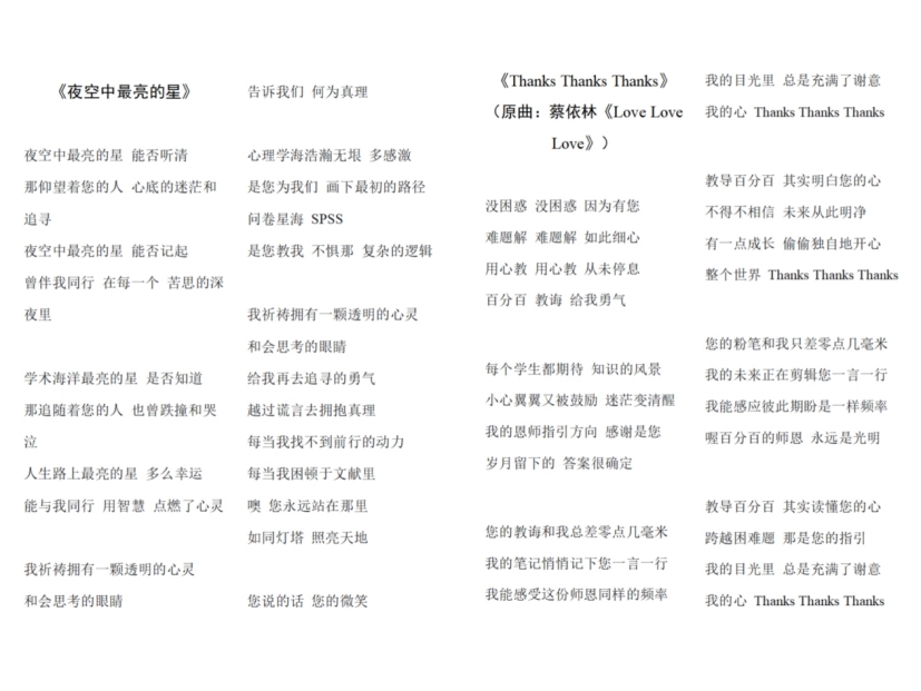 此次教师节歌词改编活动的成功举办,不仅突破了传统的教师节祝福的形式局限,还以旋律编排、歌词创作与演唱为纽带,消融师生距离,让心灵在音乐与文字中共鸣。感恩淌于旋律,真情显于字句,歌曲旋律间承载的不仅是一份来自教师节的祝福,更是学生与教师间最为真挚的师生情谊。