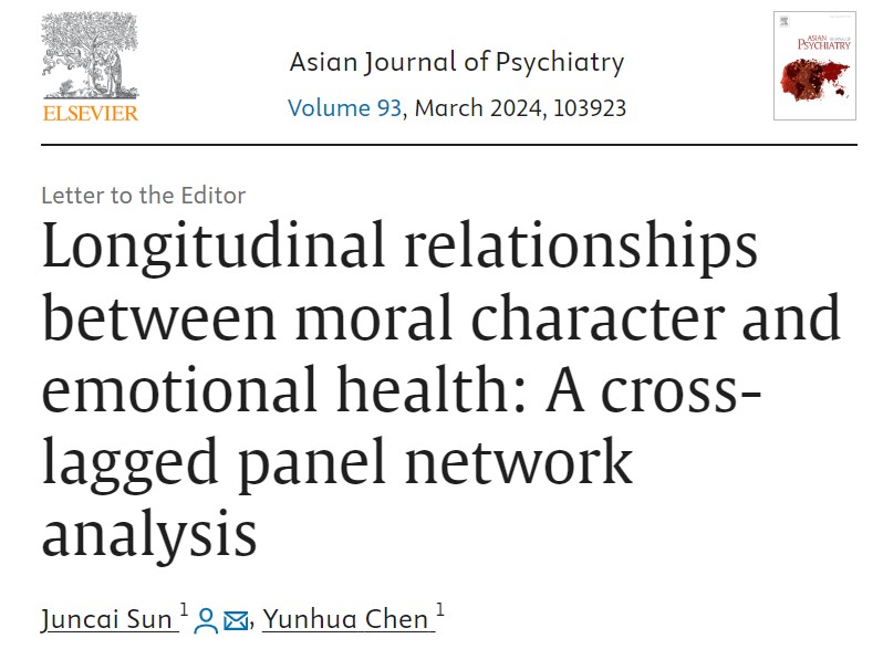 论文信息:Juncai Sun*, Yunhua Chen. 2024. Longitudinal relationships between moral character and emotional health: A cross-lagged panel network analysis. Asian Journal of Psychiatry, 93, 103923, //doi.org/10.1016/j.ajp.2024.103923.