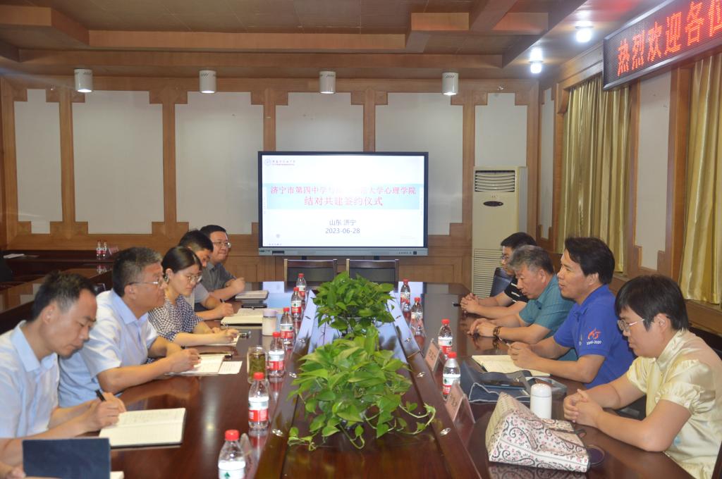 院长何文广、教授魏祥迁、孙俊才、办公室负责人贺现网一行前往济宁市第四中学开展“访企拓岗”调研活动并举办教育实习基地签约仪式,济宁市教育科学研究院心理健康教育研究员林腾飞、济宁市第四中学党总支书记、校长张磊、副校长刘伟、朱思力、工会主席田红英及相关科室主任参加活动,活动由朱思力主持。