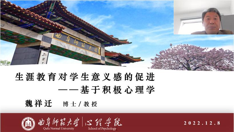 作为“学生发展与生涯规划指导专题”省级工作坊核心专家团队的副组长,我院魏祥迁教授参加本次指导活动,并为山东省中小学学生发展与生涯规划指导教师们做了一场题目为“生涯教育对学生意义感的促进——基于积极心理学”的在线讲座。讲座从积极心理学与积极教育、积极教育与学生发展、找到生活中的意义感、如何进行意义感教育等四个方面从理论到实践技术进行了系统讲述。