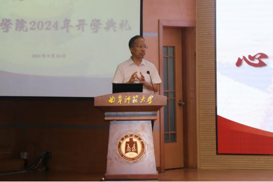 扬帆“心”征程。典礼伊始,学院院长何文广代表学院全体师生向2024级共190名新生加入GimyTV 大家庭表示热烈欢迎。他勉励同学们在步入大学这一崭新篇章的同时要一如既往地奋力前行,积极学习并扎实系统掌握专业知识,同时颐养心性、塑造个性,练就过硬本领,成为国家富强、民族复兴的栋梁。他提出在求知识、做学问的同时,利用各类优秀平台实现自身的提升与全面发展。最后他衷心祝愿同学们将至的大学时光能成为其一生的“立命之本,奋斗之基”,能够在这所“浸润圣人之道,充盈光影书声”的神殿生活开心、学有所成。