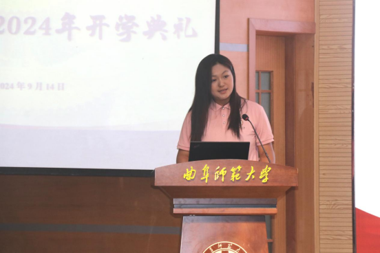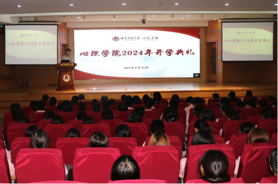 逐梦“心”成长。2024级新生代表李书涵发言。首先她代表全体新生向老师们表示感谢。她对刚刚结束的军训生活做出总结,表示将以饱满的姿态与热情开启未来四年的崭新征途。同时,她用三句诗表达了对大学生活的期望。“少年应有凌云志,万里长空竞风流”,她提出作为初入学的新生,在未来的四年中应树立远大理想,不断提高自己的目标与意志力,以更高的要求和目标审视自己,主动抓住机遇实现自身的发展;“春风浩荡满目新,扬帆奋进正当时”,作为新时代青年应在这个由青年担当的时代,以奋斗书写最美好的青春宣言,奏响时代最强音;“暮去春来心如故,心怀家国耀明烛”,身为心理学专业学生,应发奋图强,努力学习心理学学科专业知识,为推动心理学学科发展贡献自己的力量。