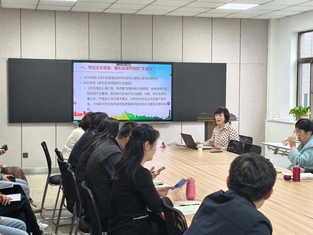黄美玲副处长围绕研究生培养政策解读、导师职责规范及学位论文质量管控等方面进行了系统讲解,强调过程管理与学术伦理的重要性,严格落实学位论文指导规范。何爱霞院长结合多年指导经验,分享了研究生个性化培养路径设计与成人高等教育质量提升的实践策略,倡导因材施教、分类指导,注重学生学术潜能与职业发展的协同培育。两位专家的报告内容详实、案例生动,具有很强的政策性与实操性,为我院导师队伍建设提供了宝贵经验。