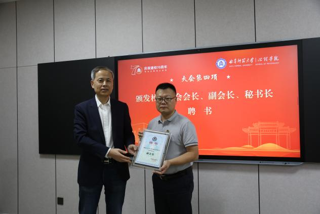 大会审议并通过了学院校友分会理事会成员名单,选举产生了分会会长、副会长、秘书长等。在热烈的掌声中,刘涛为校友分会会长、副会长、秘书长颁发聘书,徐腾飞为校友分会理事颁发聘书。