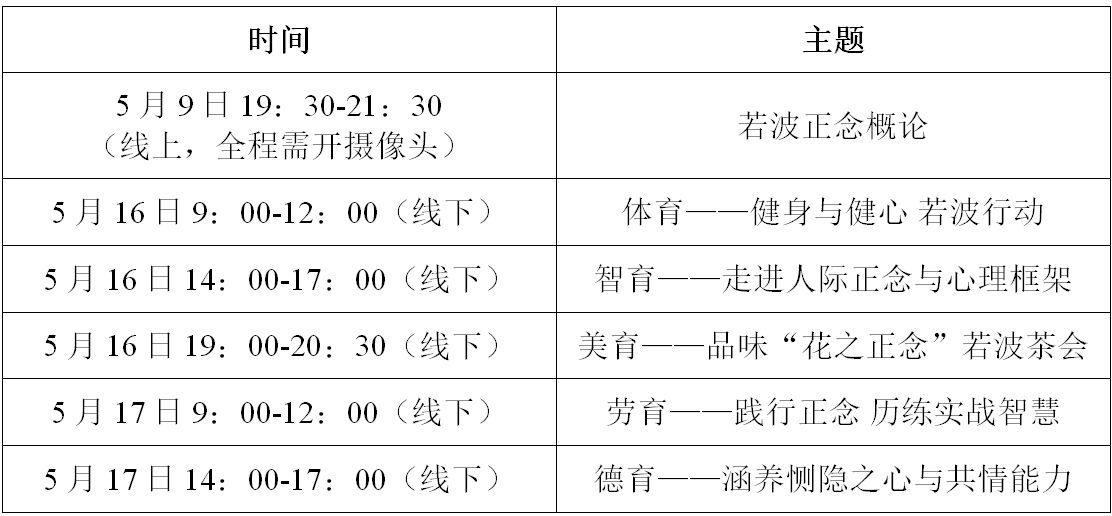 5. 理论课(可选):中华优秀传统文化与青少年心理健康教育联合培养班必修课(本项要求为获得若波正念指导师的必要条件,但可不作为本次活动报名的承诺选项。)